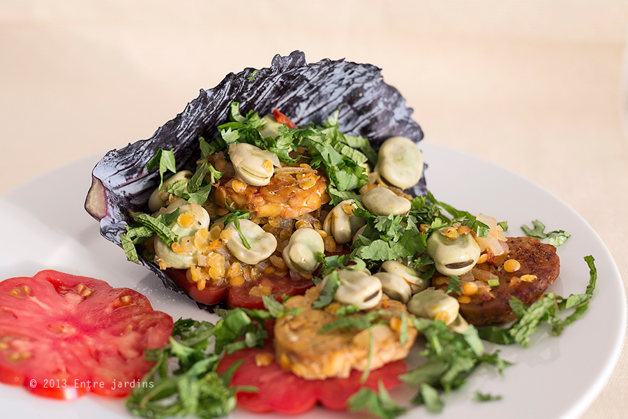 Bien que cela fasse environ 10 ans que je ne mange plus de viande, l’image des ‘favas com chouriço’ est revenue à mon esprit et je me suis mise à imaginer une version végétarienne de ce plat traditionnel portugais, concocté avec une ‘chorizo’ d’haricots au soya fermenté, qu’on appelle tempeh. Le résultat est très diffèrent de la recette originale, mais l’ensemble se marie délicieusement et est également approuvé par l’omnivore de la maison.